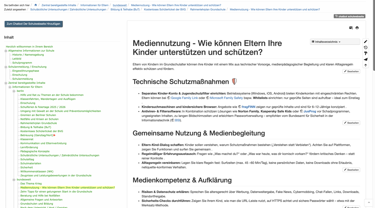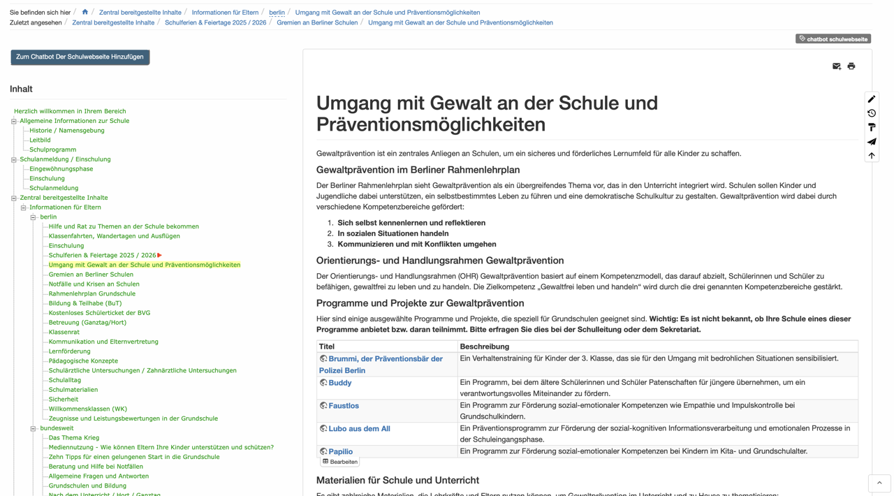 Die für Eltern relevanten Informationen können markiert und über einen Chatbot auf der Schulwebseite verfügbar gemacht werden. Hierfür stellen wir eine Vielzahl an allgemeinen Informationen zur Verfügung.