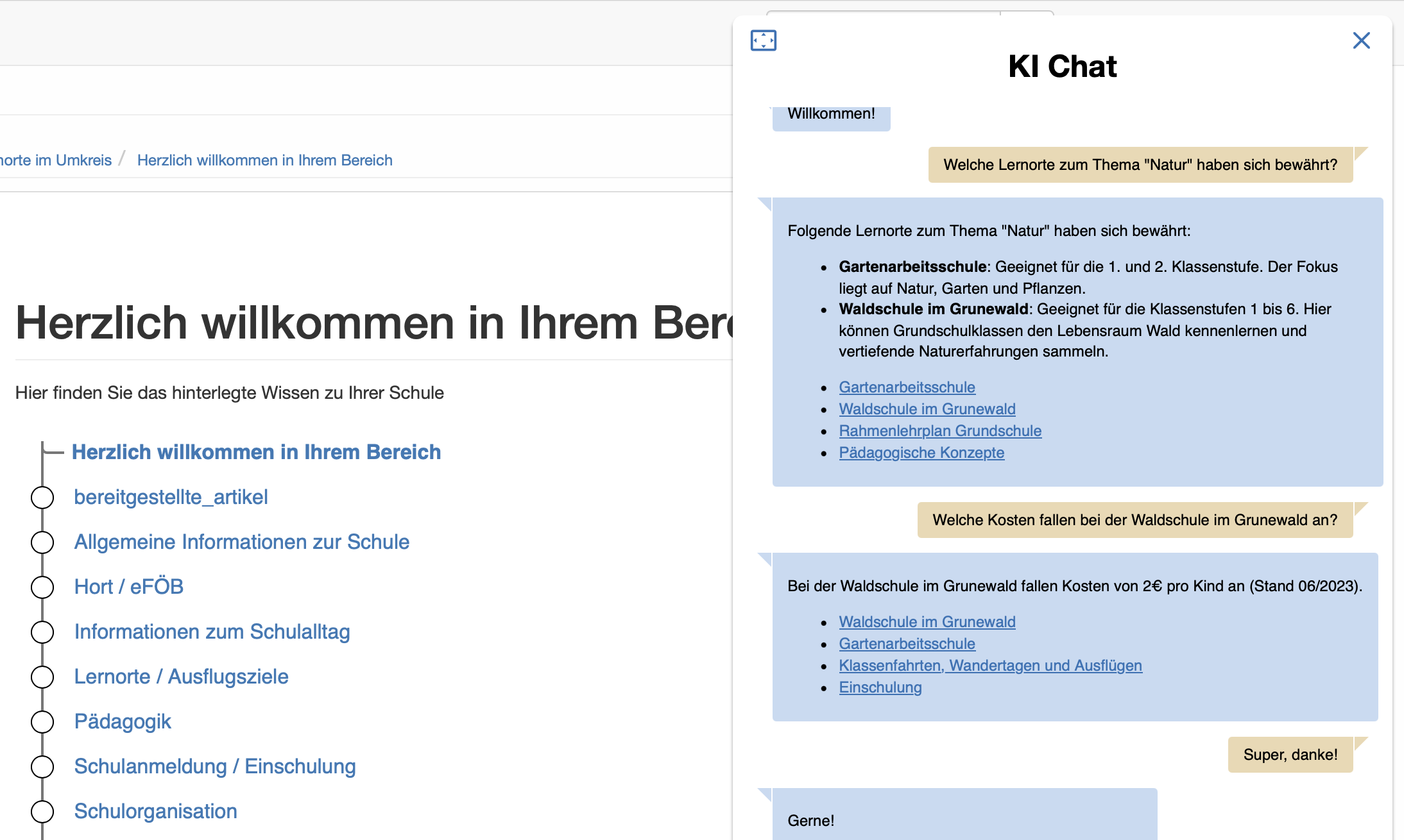 Das Besondere: Ihre gesammelten Wissensinhalte können als Grundlage für einen intelligenten Schulchatbot dienen. Intern unterstützt er Ihr Kollegium bei Fragen rund um Schulabläufe, extern beantwortet er auf Ihrer Schulwebseite häufige Fragen von Eltern und Schülerinnen und Schülern – rund um die Uhr.
